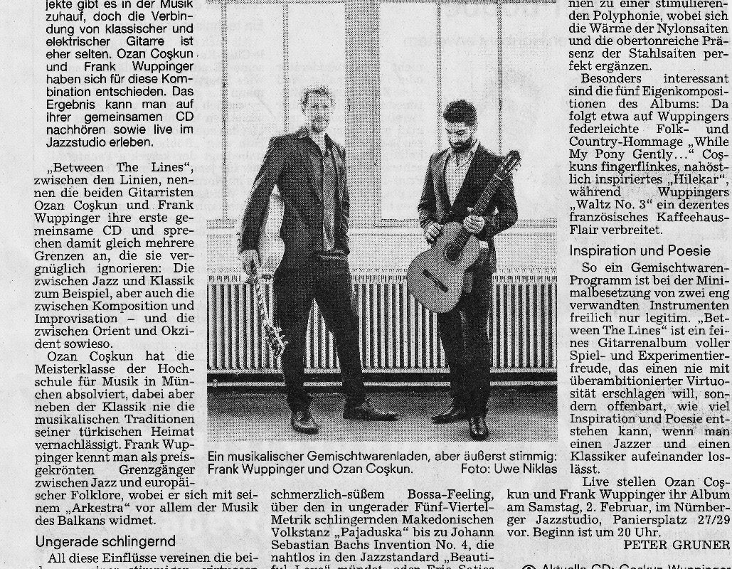 Zwei Gitarristen, die das Schönste ihrer Welten im virtuosen Zusammenspiel vereinen: Frank Wuppinger und Ozan Coşkun verzaubern ihre Zuhörer mit saitenweise handgemachtem Gitarrenspiel auf höchstem Niveau. Meisterschüler Ozan Coşkun und der Kulturstipendiat und Künstler der Metropolregion Frank Wuppinger verbinden in ihren Duo-Konzerten ihre Einflüsse aus Jazz, Klassik und orientalischer Musik. Abwechslungsreich und überraschend, anspruchsvoll und zugleich leichthändig führen sie die Ohren ihrer Zuschauer auf spannende Pfade. Jazzgitarre und klassische Konzertgitarre funktionieren wunderbar zusammen, wenn Eigenkompositionen und bekannte Klänge zu stilistischer Eigenwilligkeit vermählt werden und in einem rhythmisch-hypnotischen Klangteppich durch den Abend fließen, so dass uns selig lächelnd mit jeder Note die Erkenntnis durchströmt: „Was kann es Schöneres geben, als handgemachte Gitarrenmusik mit diesem Duo?“ (Die Welt)